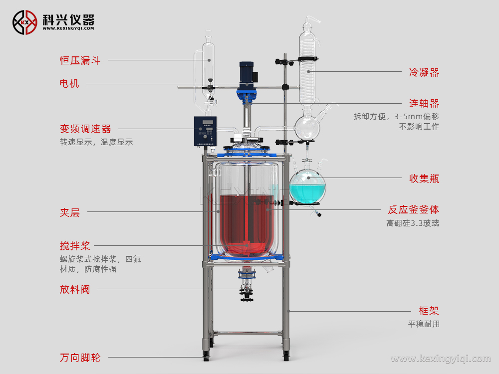 雙層玻璃反應(yīng)釜為雙層玻璃設(shè)計(jì),內(nèi)層放入反應(yīng)溶媒可做攪拌反應(yīng),夾層可通上不同的冷熱源(冷凍液,熱水或熱油)做高溫反應(yīng)(配置相應(yīng)的循環(huán)油浴鍋,溫度可以達(dá)到300℃)或低溫反應(yīng)(配置相應(yīng)的低溫冷凍液循環(huán)系統(tǒng),溫度可以達(dá)到-80℃),也可選擇加熱制冷一體循環(huán)機(jī);在設(shè)定恒溫條件下,在密閉的玻璃反應(yīng)器內(nèi),可根據(jù)使用要求在常壓或負(fù)壓條件下進(jìn)行攪拌反應(yīng),并能做反應(yīng)溶液的回流與蒸餾,使用中可以抽成真空,從而做真空反應(yīng)。是現(xiàn)代精細(xì)化工、生物制藥和新材料合成的理想中試、生產(chǎn)設(shè)備。它的這種設(shè)計(jì)使試驗(yàn)更加的安全,更加的方便。